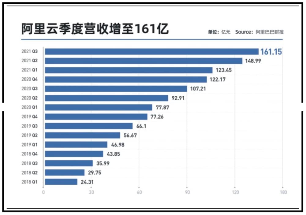据悉阿里云在考虑独立运营,并上市的计划。知情人士称月底之前阿里云内部还会进行一轮架构调整。另外一位曾任阿里云的高管称,一直有听到阿里云独立的传闻,但未得到确切信息,但他认为一定会拆分,对于阿里云并入蚂蚁的传闻表示未有耳闻。阿里巴巴集团2021财年第三季度(对应自然年10月~12月)显示: