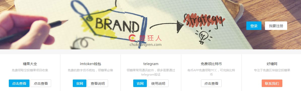 <div class="focusbanner" style="background-image:url(http:/图片地址)"> <div class="container"> <a href="javascript:;" class="signin-loader"><p class="btn btn-primary">登录</p></a> <a href="javascript:;" class="signup-loader"><p class="btn btn-whrite">我要注册</p></a> </div> </div> <div class="container"> <ul class="eboxx"> <li class="eboxx-i eboxx-01"> <h4>糖果大全</h4> <p>免费领取空投糖果项目收集</p> <a class="btn btn-sm btn-primary" target="_blank" rel="nofollow" href="http://haotang.wang/candy">点击查看</a> <a class="btn btn-sm btn-default" target="_blank" rel="nofollow" href="http://haotang.wang">点击查看</a> </li> <li class="eboxx-i eboxx-02"> <h4>imtoken钱包</h4> <p>免费的数/字/货/币钱包,领糖果必备</p> <a class="btn btn-sm btn-primary" target="_blank" rel="nofollow" href="https://token.im">官网</a> <a class="btn btn-sm btn-default" target="_blank" rel="nofollow" href="http://haotang.wang/510.html">查看说明</a> </li> <li class="eboxx-i eboxx-03"> <h4>telegram</h4> <p>领糖果常用通讯软件,很多需要通过telegram验证</p> <a class="btn btn-sm btn-primary" target="_blank" rel="nofollow" href="http://telegram.org/">官网</a> <a class="btn btn-sm btn-default" target="_blank" rel="nofollow" href="http://haotang.wang/275.html">使用说明</a> </li> <li class="eboxx-i eboxx-04"> <h4>免费领比特币</h4> <p>有币APP免费领取YCC,可兑换比特币</p> <a class="btn btn-sm btn-default" target="_blank" rel="nofollow" href="http://haotang.wang/36.html">点击查看</a> </li> <li class="eboxx-i eboxx-100"> <h4>好糖网</h4> <p>专注于免费链空投糖果</p> <a class="btn btn-sm btn-danger" target="_blank" rel="nofollow" href="">联系我们</a> </li> </ul> </div>
