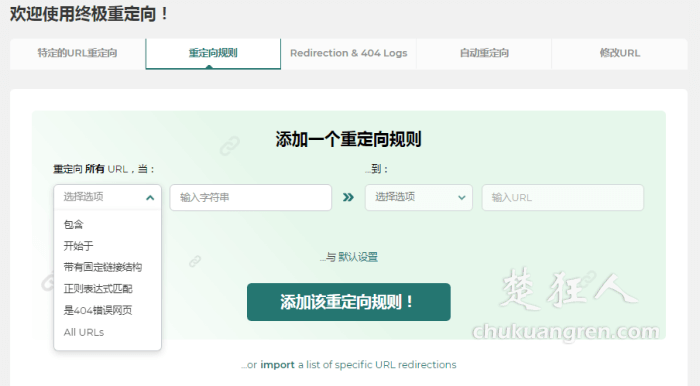 重定向规则:有简单的规则,也有复杂正则表达式匹配,包含替换或删除具体字符串、某字段开头的URL、具体永久链接结构、正则表达式匹配、404错误页面。
