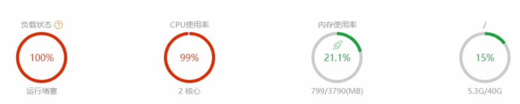 当我们网站被卡住时,通过宝塔面板首页,可以看到如图所示“负载状态100%”,运行堵塞,这就像一条公路被堵住了,用户访问自然会被卡住。我们要做的就是找出云服务器负载状态100%的原因,并有针对性的进行优化。