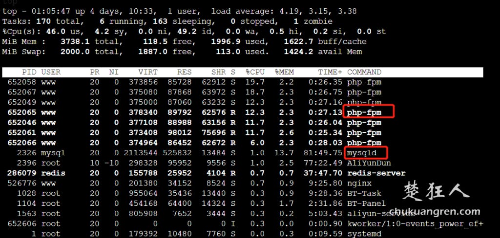 如下图显示php-fpm占用CPU过高,那么我们可以针对性的进行PHP优化: