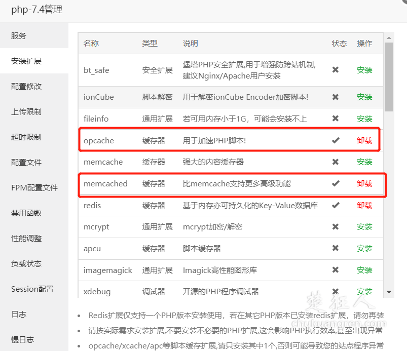 软件商店——找到 PHP——设置,找到安装扩展,选择安装 OPcache 与 Memcached 扩展。