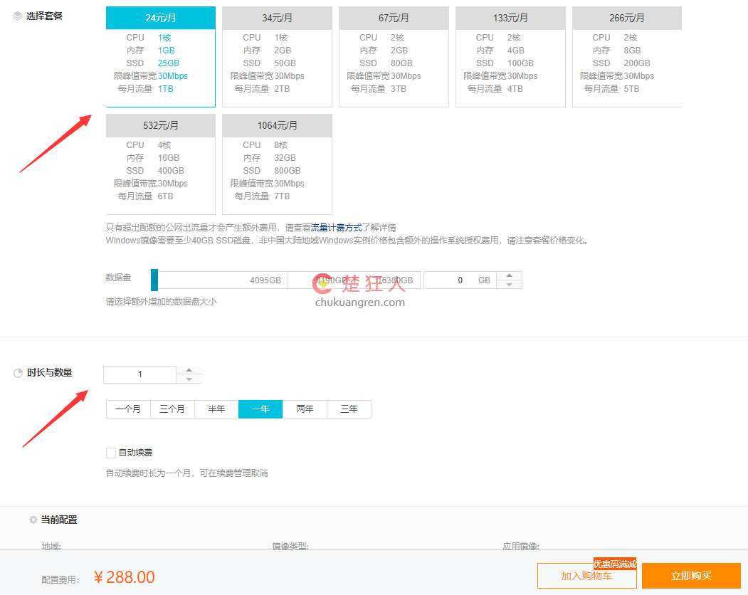 可以看到基本款的轻量应用服务器优惠后的价格只要24元/月,这个配置秒杀多少虚拟主机?至于购买时间大家可以根据自己的需要选择,我这里选择的时间只是给大家演示一下,如果不确定建议选3年,因为我们现在的购买价格是优惠价格,以后续费价格可能会高很多,所以……阿里云还是新客户享福啊。