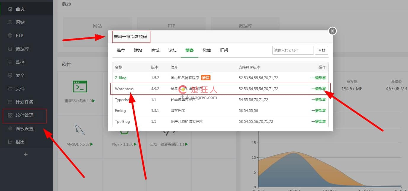 接下来就教大家如何使用这轻量应用服务器自己搭建网站。假设我们上面购买时时选择安装宝塔面版的Centos系统,集成了各种环境与功能。可以自由安装任意建站系统,我们还以wordpress举例: