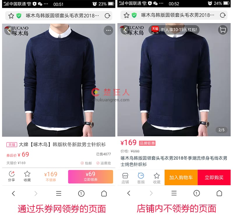 然后我们点开领券页面和不领优惠券的页面对比一下: