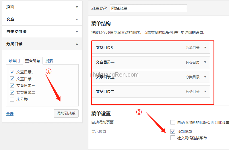 6、创建导航菜单,把刚才设置的分类目录添加到菜单,另外还可以自己添加自定义链接,比如首页等。