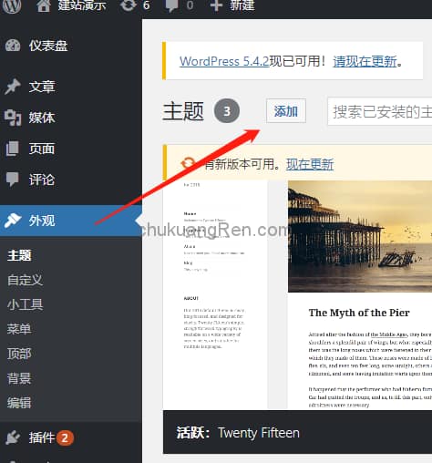 wordpress安装之后默认自带三个主题,但是一般满足不了我们自己建站的个性化需要,此时可以在后台主题中选择“添加”。