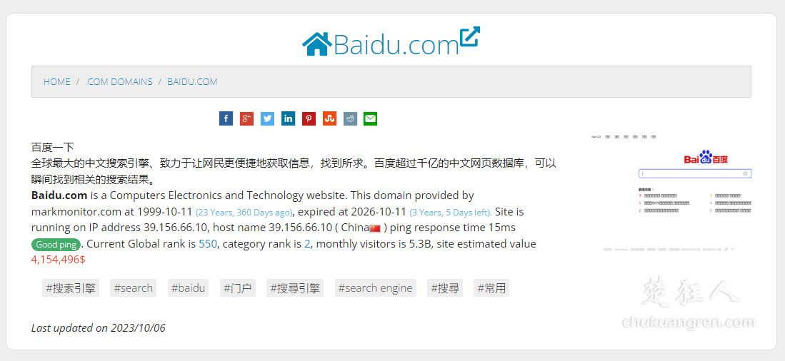 siteprice是一个免费的网站价值计算器和域名评估工具,也可以作为网站流量检查器。可帮助您查找网站市场价格和域名价值,同时会给出与网站相关的33个类似网站以供参考,不过我主要使用这个网站来估算网站的价格,siteprice通过使用多种信息以及从互联网资源收集、收集和分析数据来估计网站市场价格(而非商业价格)。